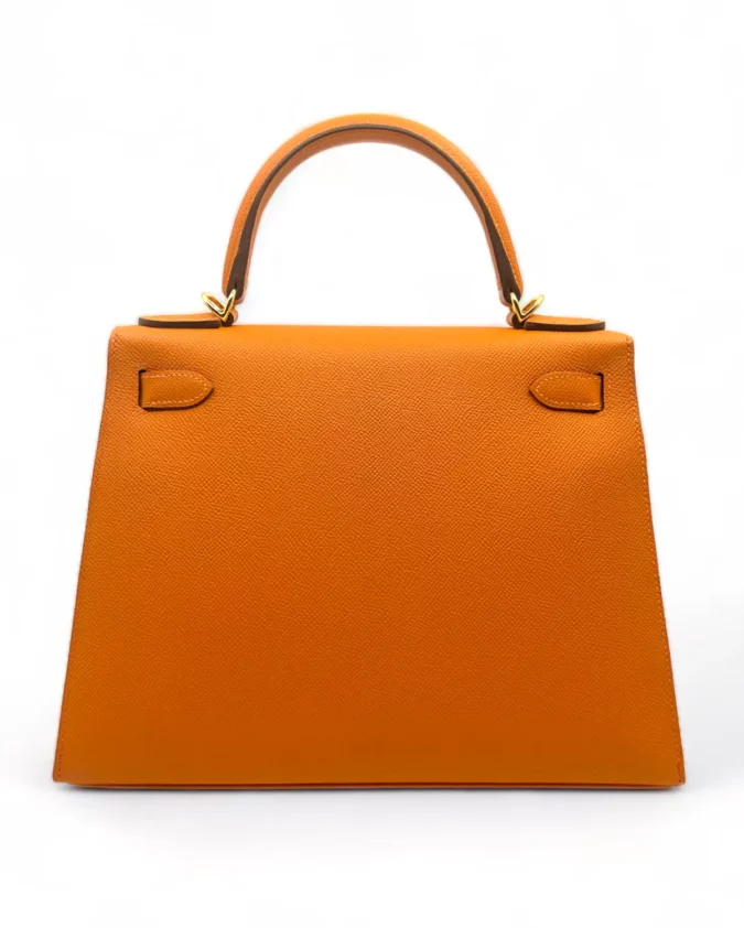Confectionné en cuir Epsom, connu pour sa légèreté et sa résistance, il se distingue par ses coutures ton sur ton orange qui subliment la finesse du travail artisanal Hermès. Sa bijouterie en or brossé (BGHW) ajoute une touche de chaleur sophistiquée et rare, parfaitement équilibrée entre éclat et discrétion.