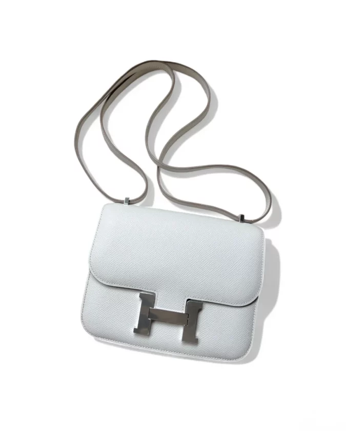 Réalisé en cuir Epsom, au grain fin et à la structure ferme, il se présente ici dans le subtil Gris Misty, une nouvelle teinte (2025) douce et moderne qui se marie parfaitement à la bijouterie Permabrass (PBHW), rare et sophistiquée.