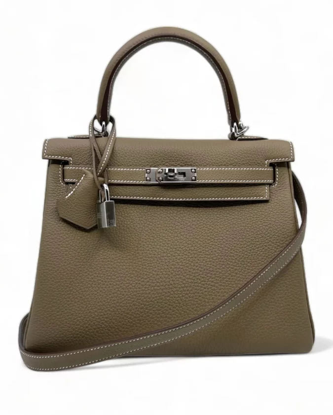 22,062.25$Kelly 25 en cuir Togo Étoupe, finitions palladium. Subtile et sophistiqué, ce Kelly 25 en cuir Togo arbore la teinte Étoupe, iconique chez Hermès, relevée de surpiqûres blanches et de finitions palladium. Format idéal pour une allure structurée et raffinée, il conjugue modernité et intemporalité avec équilibre.