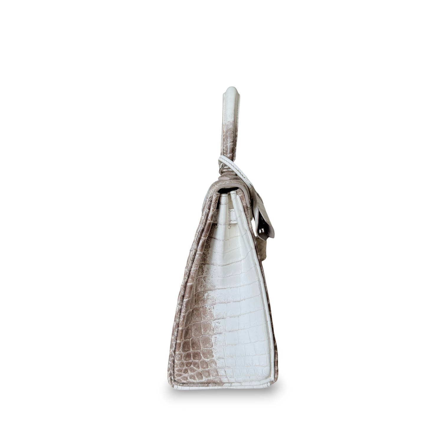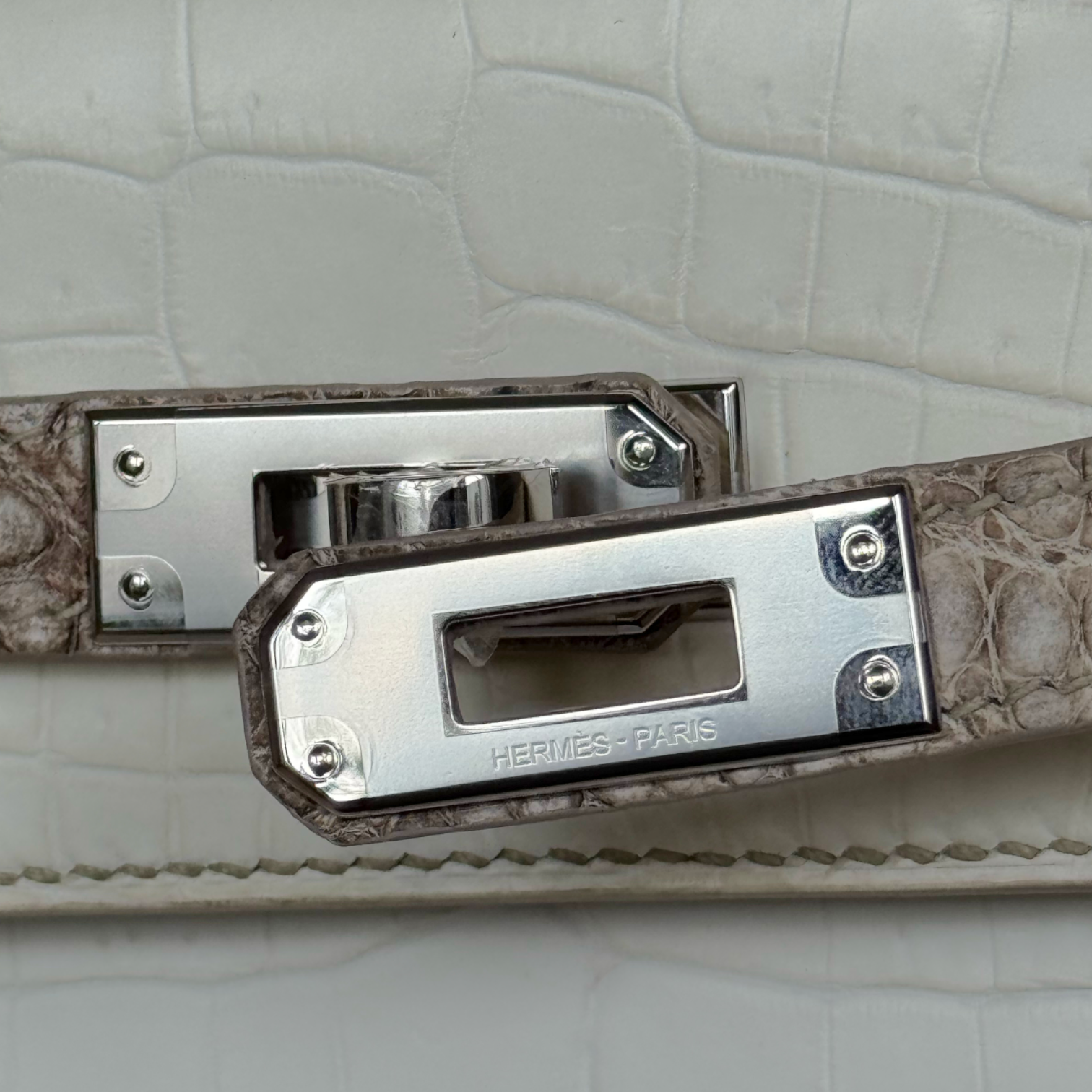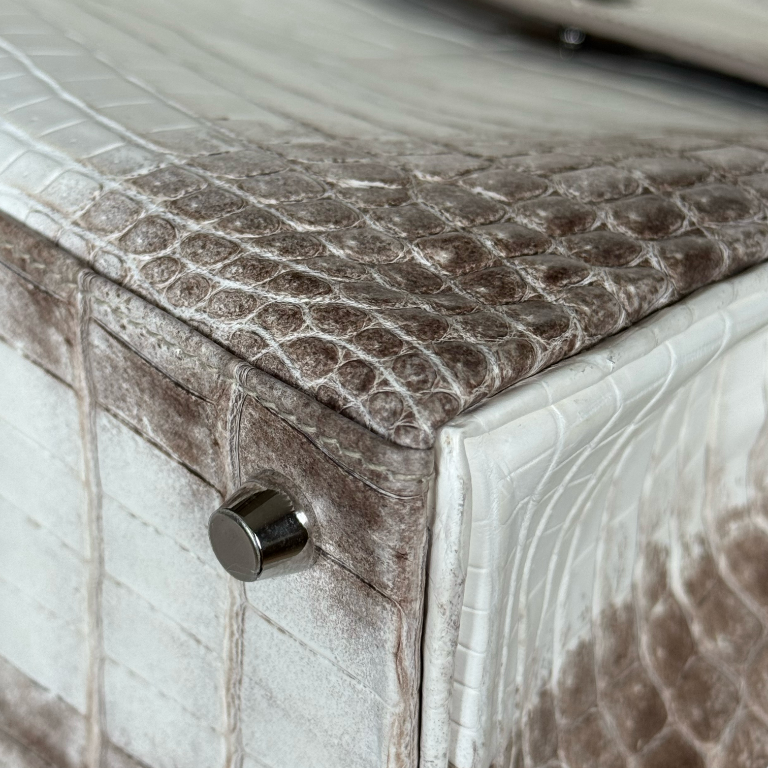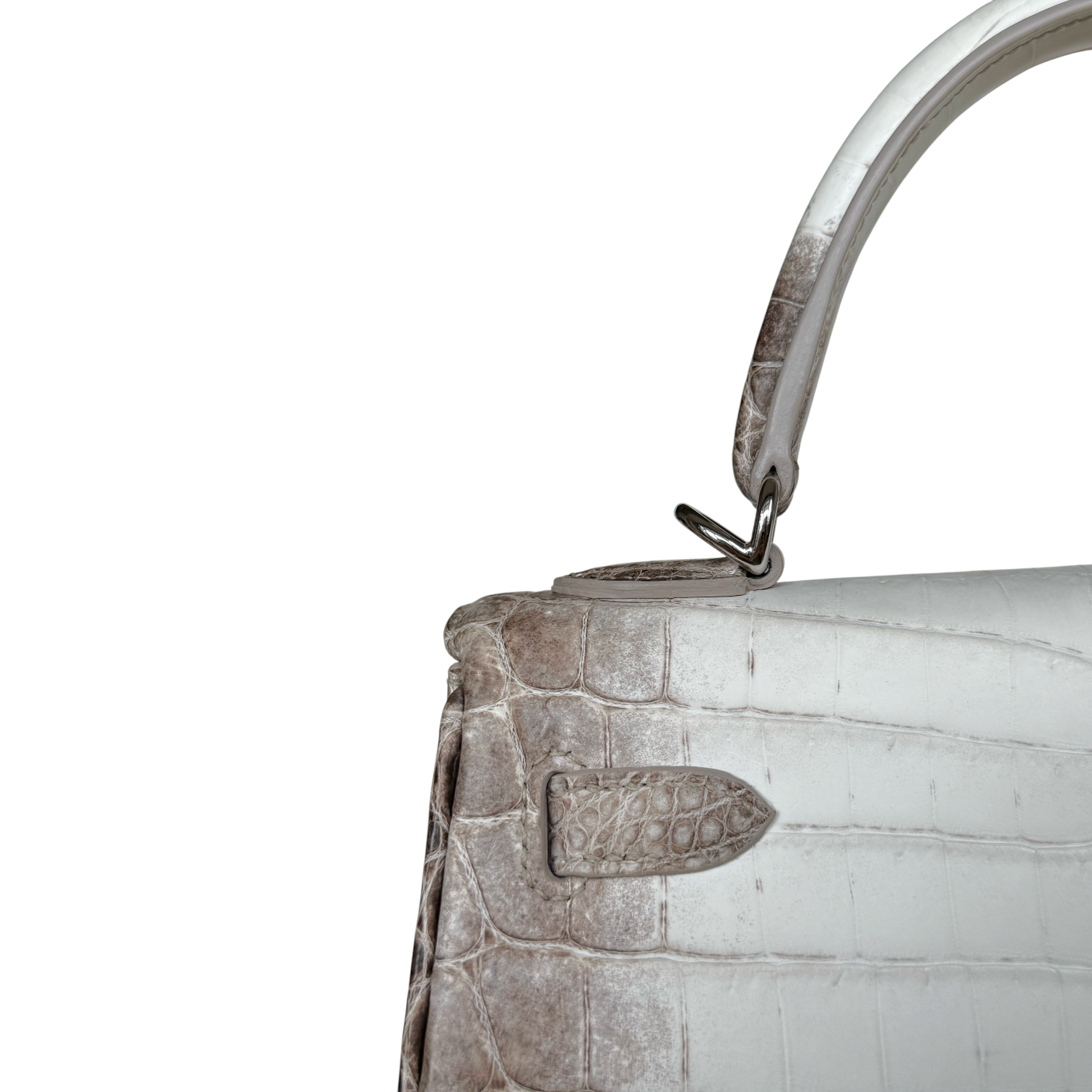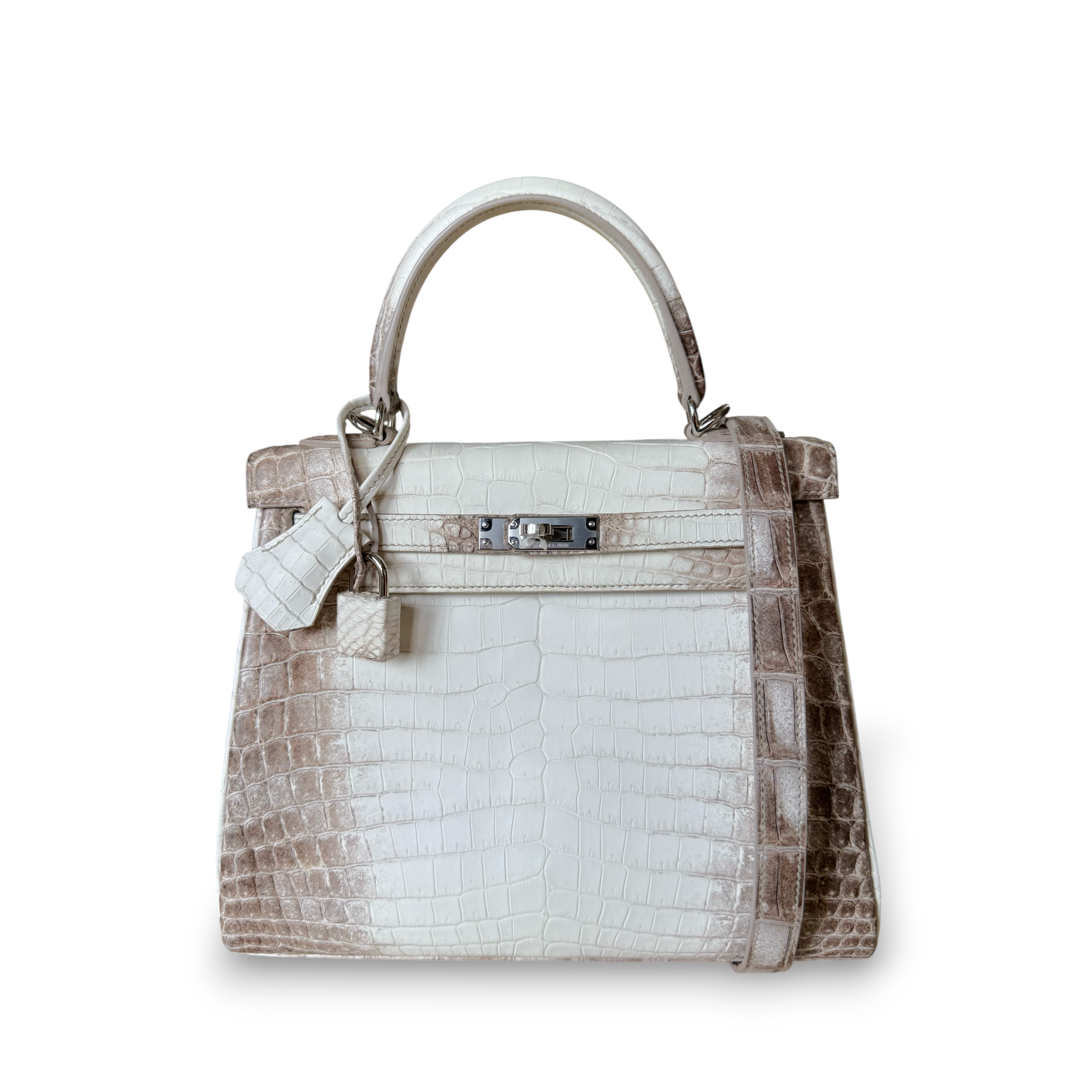 Véritable graal de la collection Hermès, le Kelly 25 Himalaya incarne l’apogée du savoir-faire artisanal et du luxe absolu. Réalisé en crocodile Niloticus, ce cuir exotique d’exception se distingue par son dégradé naturel mythique, allant du beige ivoire lumineux au gris perlé délicat, évoquant les neiges éternelles de l’Himalaya.