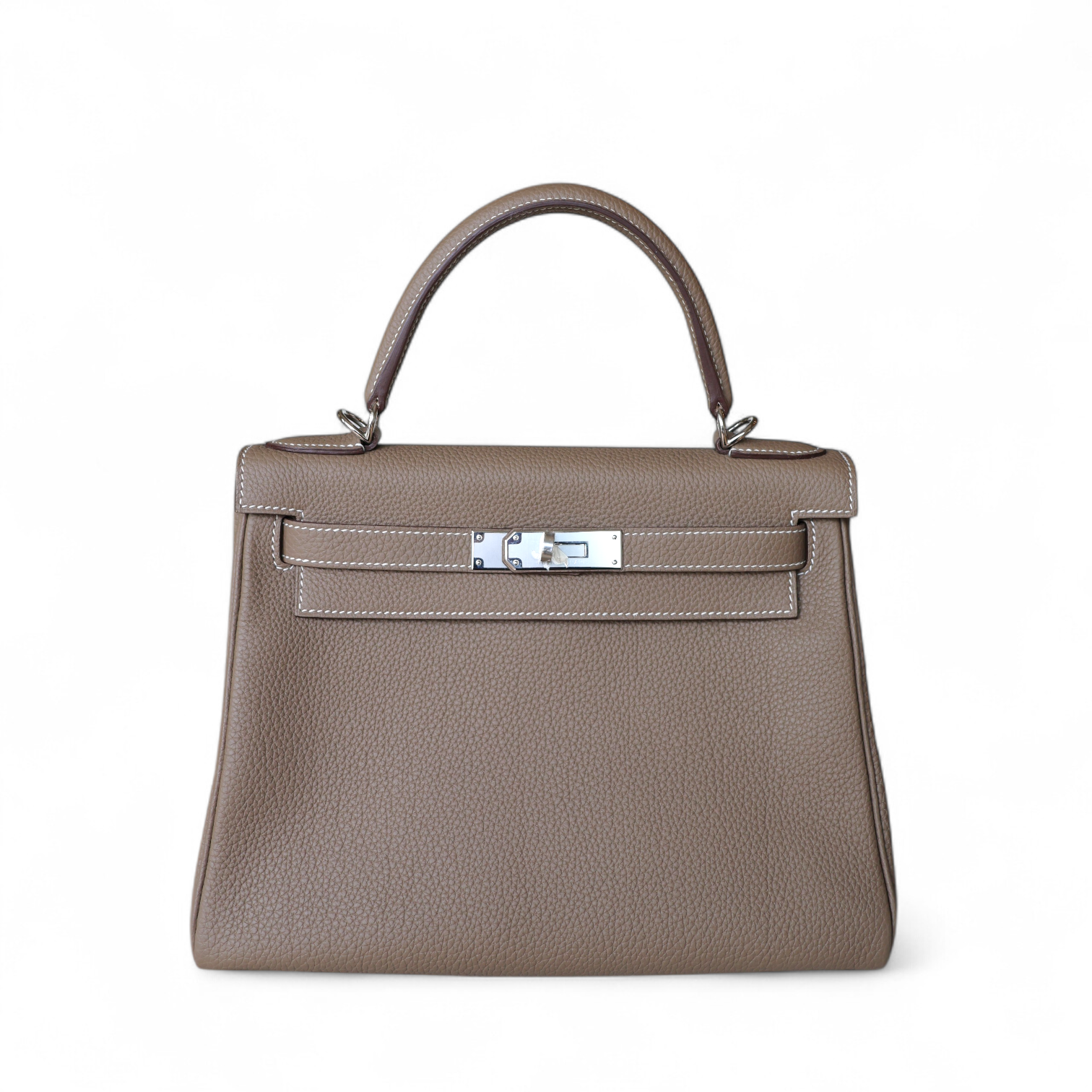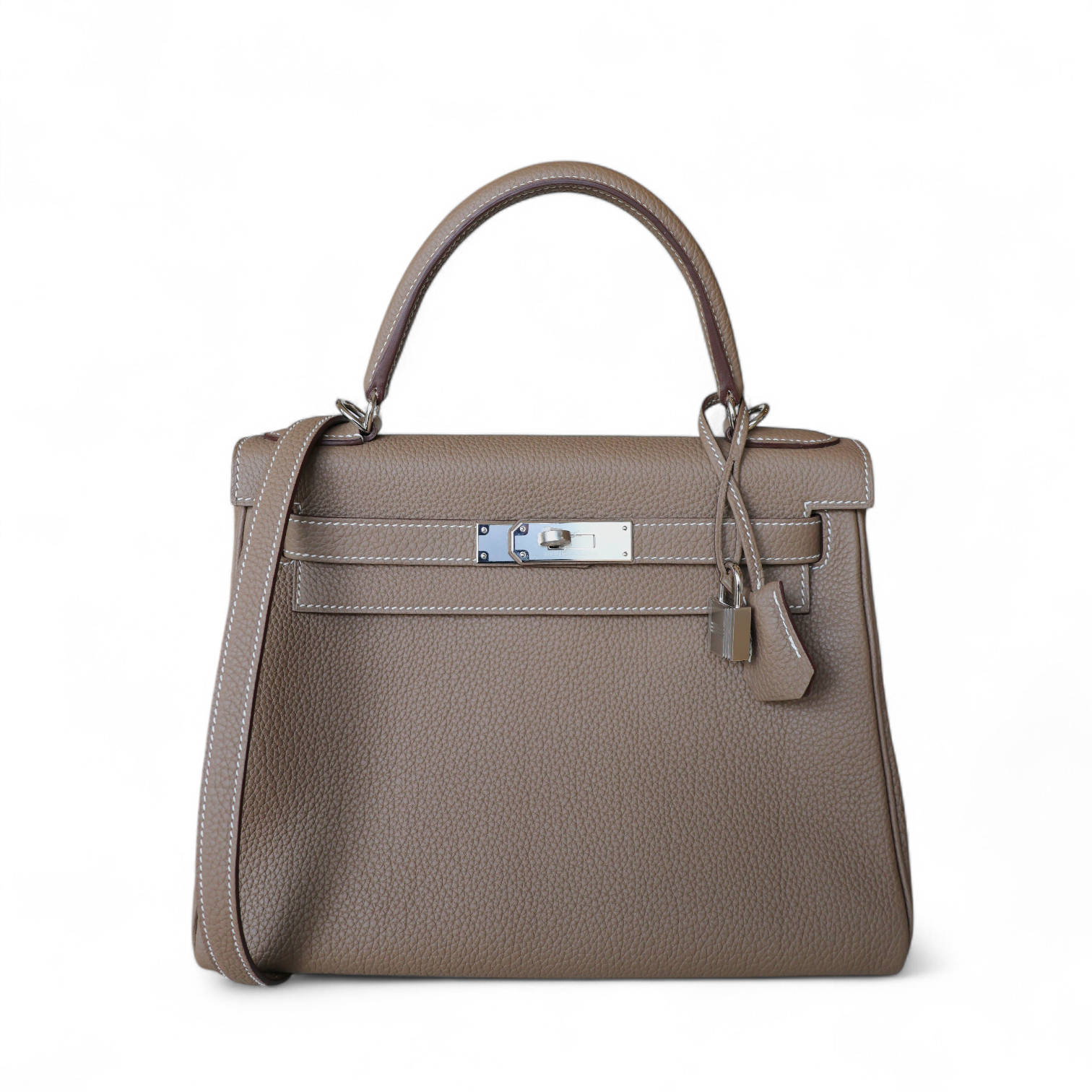 Un classique absolu de la Maison Hermès : ce Kelly 28 incarne l’élégance intemporelle avec sa teinte emblématique Etoupe, un taupe lumineux rehaussé de surpiqûres blanches contrastantes. Réalisé en cuir Togo, souple et grainé, il allie robustesse et raffinement, idéal pour un porté quotidien tout en conservant une allure sophistiquée.